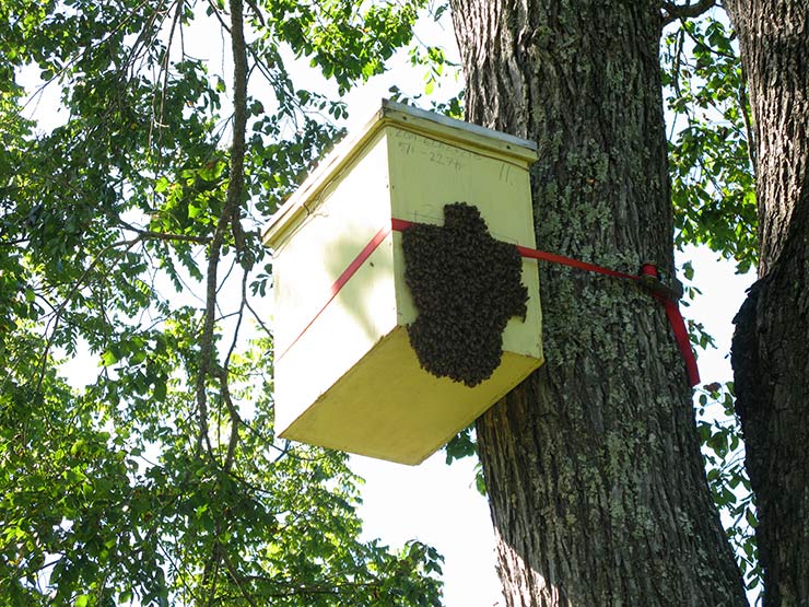 Bee colonies have one queen that lays all the eggs, surrounded by her children: thousands of female workers and a few hundred drones (males that fertilize queens from other hives). Bee colonies propagate by swarming: before a new queen hatches from her cell, the old mother queen and half the bees from the hive fly off in a swarm and find a new empty cavity to establish their home. Hang a few small hives (called swarm traps) on trees come spring, and many of them will attract free local swarms. It really works (see Tom’s testimonial above); in fact, this is exactly how people have been obtaining free bees for their hives throughout history and throughout the world. See more detail in our free swarm-catching guide and in the instructions for using swarm traps.