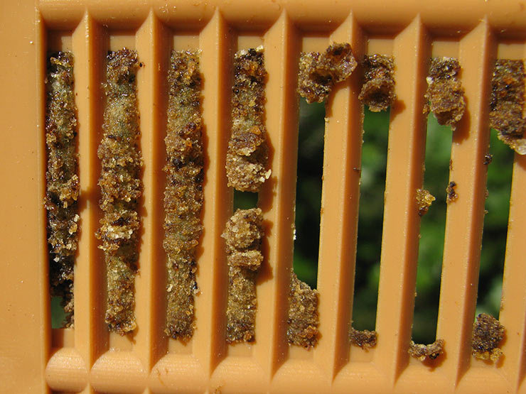 Bees start filling the propolis collector screen from the top down. After 2–3 weeks it’s a good idea to check it and if the top half is well filled, rotate it 180° and re-insert, to encourage the bees to finish filling the other half. If the screen is not rotated, a band of slots toward the bottom may be left completely free of propolis. This is consistent with how bees coat the walls of their tree nests — good propolis envelope at the top, but more sporadic application toward the bottom.