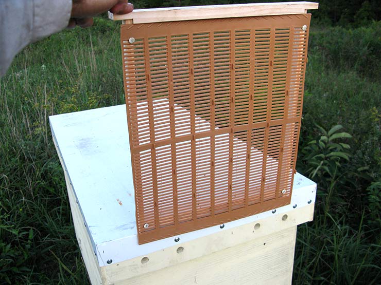 I normally harvest honey after the first frost (late October–early November), but if propolis collector is to be used, you need to harvest honey and insert the collector about six weeks before the first frost. (Here in the Ozarks in southern Missouri, around September 1.) This gives bees enough time to collect propolis while the weather is still warm. Because resin hardens in low temperature, bees can’t collect propolis in late fall after the first frost. If some of the honey you pull is still not capped and has high moisture content, you can give the frames to another strong colony to ripen and cap.