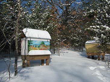 We use the wintering setup shown in Layens’s book, Chapter 24. For example, for a strong colony (bees cover 7 frames) at harvest time leave up to 7 frames at least 1/2 full of honey (about 30 lb), plus (in cold climates with springs that can be cool or rainy) two extra frames more or less full of honey, one on each end of the nest (9 frames total, about 45 lb). Fewer frames are required for smaller colonies or in southern climates with short winters.