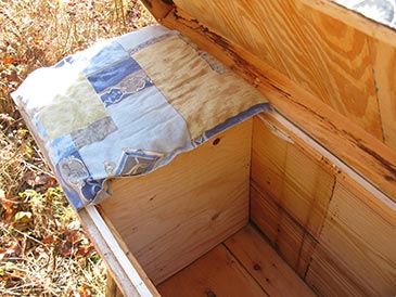 The 20-frame Layens hive insulated with natural wool offers the best protection from the cold of the winter and the heat of the summer. The walls and the bottom are permanently insulated with 1-1/2” of fleece; frames’ top bars are covered with a pillow stuffed with wool. A pillowcase filled with natural wool is best and has far better insulation value than other materials such as wood shavings. Leave at least 1/2” air space around and above the pillow to aid ventilation. This is our favorite wintering setup.