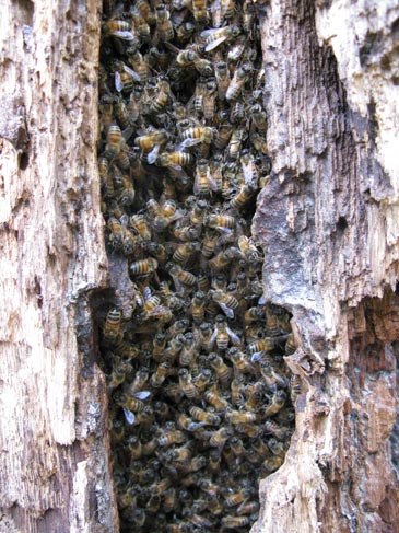 There is a bee tree in the woods near my house. Actually not even a tree, but an old hollow snag. When I first saw it I had trouble believing that bees could live in there. That was because of the entrance — a large gap some four inches wide by twelve inches tall. How could they possibly survive the winter with an “open door” like that? It had been the coldest winter in decades, with temperatures staying around zero for several weeks. But survive they did: the opening was teaming with bees; there were so many that they were spilling out of the hollow. I took a spoon and to their great displeasure spread them apart enough to reveal the completely black comb inside, confirming that the colony had lived in this cavity for many years. (Bees’ white comb becomes darker and darker with each generation of “babies” raised in its cells.)