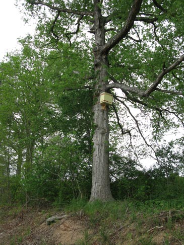 This fence row oak is an ideal swarm trap site that stands out. Prominent, highly visible, easily accessible, fully shading the box, adjacent to natural vegatation, and close to a creek.