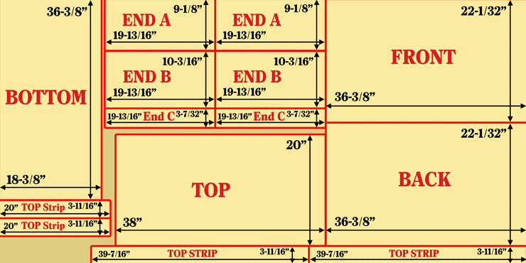 Cut 3/8” by 1/4” rabbets along the outer bottom edge of parts “End A”, the inner top and bottom edges of parts “End B”, and the outer top edge of parts “End C”: