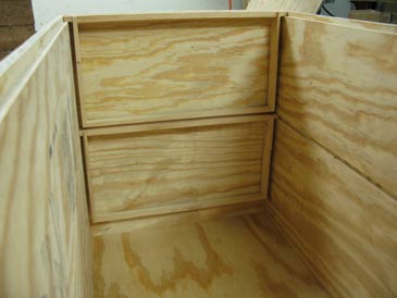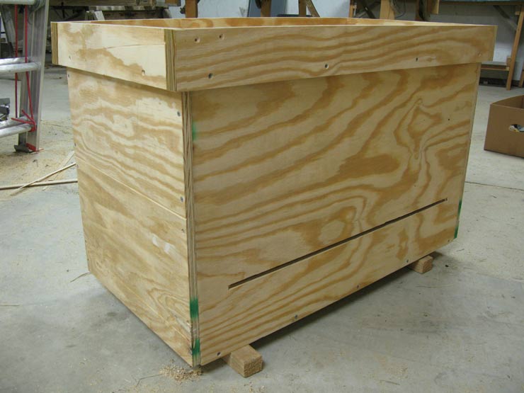 With this setup you can use standard frames while retaining many of the advantages of the extra-deep horizontal hive. The model described below will hold a maximum of 52 deep frames (26 per tier) on 1-3/8” spacing. The 2-5/8” free space under the lower frames is enough to install wire mesh and oil pans for pest control, if desired. The hive is made from a single 4’ by 8’ sheet of 23/32” sheathing plywood using a circular saw, a table saw with a dado blade, and a drill. It is assembled on 2-1/2” exterior wood screws. Here are step-by-step building instructions.