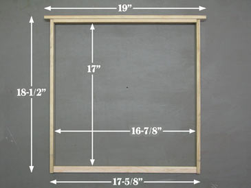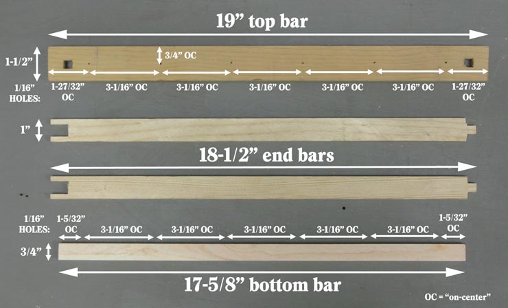 The frame has standard length (17-5/8” long with a 19” top bar - same as Langstroth). It consists of four parts: a top bar, two identical end bars, and a bottom bar: