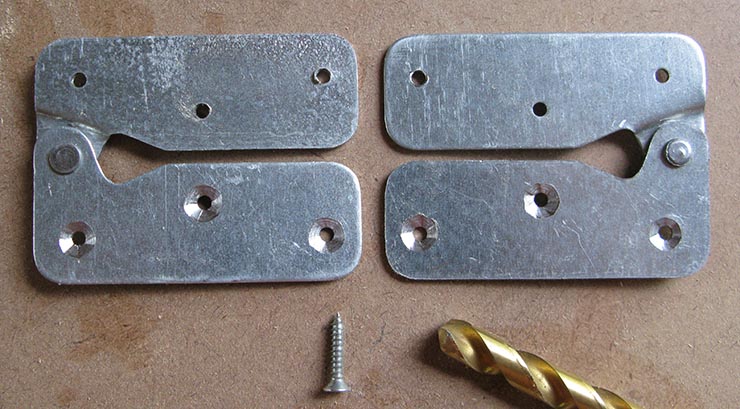 Step 5. Put the hinges in front of you as shown, the inside of the hinge facing up and the fold above the pivot. Using a drill bit, carefully drill the countersinks in the three lower holes. Thanks to these countersinks the head of the screw will be almost flush with the hinge when installed.