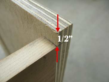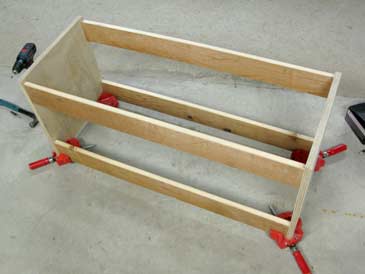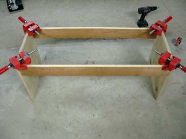 Step 1. Position the two plywood panels upright (with the narrow side on the floor). Clamp two boards between the plywood, 1/2” lower than the top of the plywood. Pre-drill and assemble on two screws per corner.