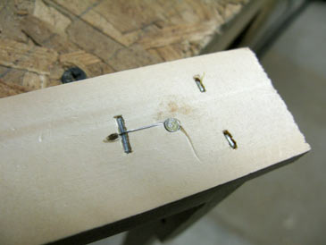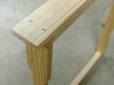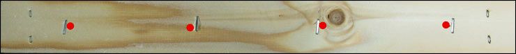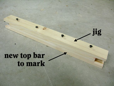 Mark the holes and drill from the bottom side of the top bar (the side that will look inside the frame). 3/32” drill bit and a hand-held drill do the trick. To mark holes quicker, make a jig: take a top bar with the holes you just drilled and drive 1-1/4” drywall screws into the holes so they protrude by 1/16” on the bottom side. Press the jig on the new top bar, and hole positions are impressed. Voila!