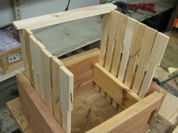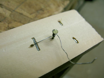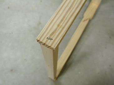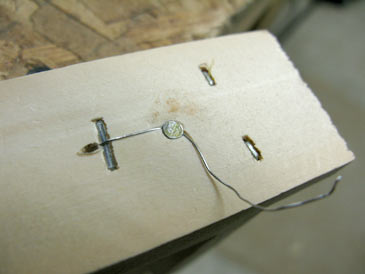 It is handy to make a jig that will hold the end bars square while you attach the top bars and bottom bars. Click here for jig plans. If you don’t assemble too many frames, you can just check the angle with a square as you nail them together. Apply a bead of wood glue and drive two 1” staples (or hammer in nails) through the top bar into the end bar; then one through the end bar back into the top bar; then one staple through the end bar into the bottom bar. The frame is ready. Wait at least 24 hrs for the glue to cure before wiring.