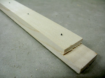 The bottom bar is simply a plank 12-3/16” x 5/8” x 3/4” ripped from any “one-by-” or “two-by-” stock. The holes along the center of the 3/4” side are made the same way as on the top bar (drill from the top side of the bottom bar, i.e., from the side that looks inside the frame).