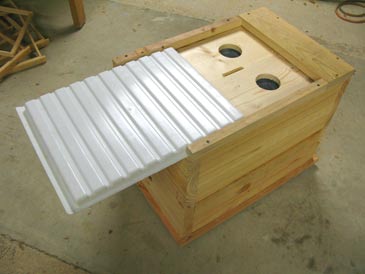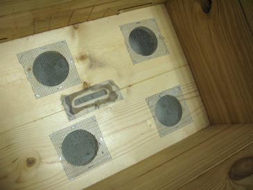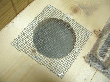 Step 2. Cut four 4” x 4” pieces of wire mesh with 1/8” cells, and staple them over the openings, from inside the hive, using 3/8” T50 staples.