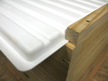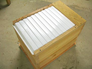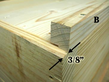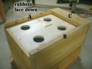 Step 4. Position parts A, B and C over the bottom of the hive, flush with the walls, butts of parts A and B 3/8” shy of the edge. Predrill and attach to the hive body with 2” screws. Make sure the screws don’t go through the rabbet. Done!