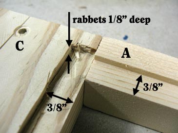 Step 3. Cut two bars (A & B) 1-1/4” x 1-1/32” x 19-1/4” and one board (C) 5-1/4” x 1-1/4” x 16-11/16”. Put them together in a U-shape and cut a rabbet 3/8” wide x 1/8” deep along the inner perimeter of this assembly.