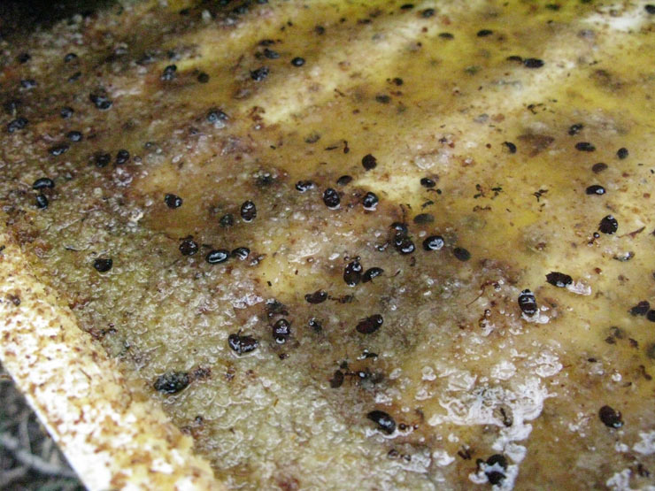 But oil pans require regular cleaning as they become clogged up with pollen and wax. As foragers unload their pollen loads into cells, they drop some. The same goes for the wax scales produced for comb construction. With solid-bottom hives bees can pick up dropped pollen and wax and reuse it. But falling through the screen bottom, wax and pollen are lost to the bees and accumulate in the tray, turning oil into thick paste. If you don’t remove pollen/wax deposits on time, they absorb all the oil; small hive beetles are then able to walk over this mass without drowning and the pest control tray becomes breeding ground for vermin.