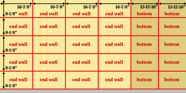 Step 1. Cut the 15/32” plywood as shown. You’ll end up with twenty pieces 16-7/8” x 9-1/8” (end walls) and ten pieces 13-15/16” x 9-1/8” (bottoms).
