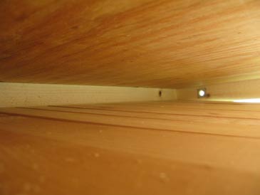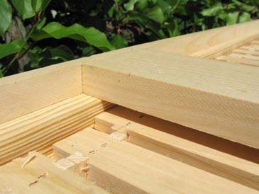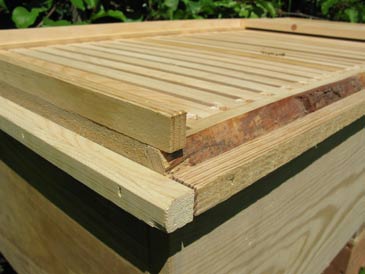 The cover boards are ripped from “one-by” stock. I like making them about 2-5/8” wide. Do not make them too wide: they will warp. (This is because the space under the boards is more humid than the space above them.) Two of the boards have ventilation holes in the middle: 1-1/2” diameter, covered with metallic insect screen stapled into place from the bottom side. I place these vented cover boards towards each end of the box. Use insect screen to cover these openings (not 1/8” wire mesh, which will let small hive beetles and other vermin pass through it).