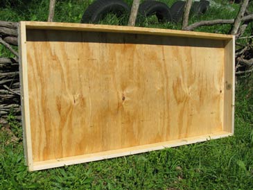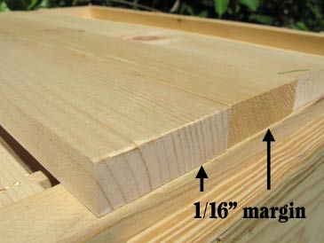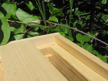 The ledge is made of 3/4” square bars running along the perimeter 1/2” down from the edge. Two sticks 21-3/8” long; two sticks 49-5/16”. The top can be attached on hinges. Exactly the same principles apply to building a ventilated gable (peaked) hive roof with a layer of cover boards underneath. Enjoy!