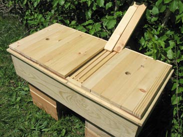 The hive top has a 3-1/2” rim (made from “one-by-four”) and 3/4” diameter screened vents on both ends, centered. It is covered with aluminum flashing or, better still, white aluminum trim coil (to avoid glare). This top allows for some 2” above the cover boards, being propped up by the ledge running around the hive box.