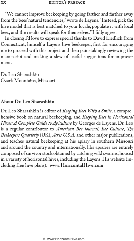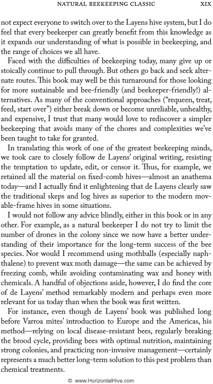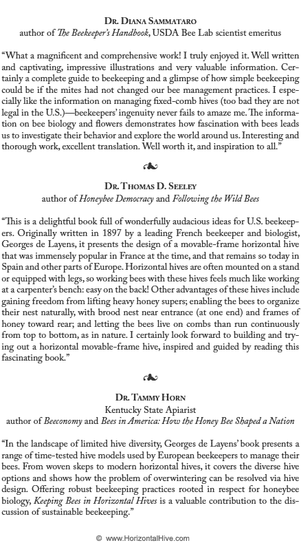 “This is a delightful book full of wonderfully audacious ideas for U.S. beekeepers. I certainly look forward to building and trying out a horizontal movable-frame hive, inspired and guided by reading this fascinating book.”