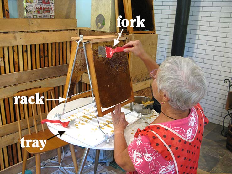 The only other tools (optional) are an uncapping rack to hold the frames while you remove the wax caps covering the honey cells, and a tray that the rack mounts to to catch the dripping honey. This setup is very convenient but optional: you can hold frames with your hand and use any cookie sheet to catch the drips. A variety of uncapping tools are available — from a simple kitchen knife or fork to special wide uncapping forks, rollers that puncture the seals instead of removing them, and knives (including heated and vibrating models). We use inexpensive uncapping forks available online.
