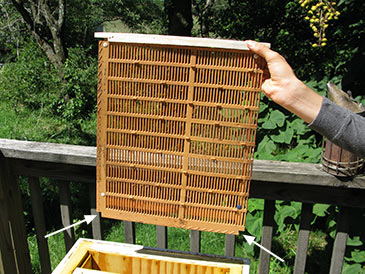 I normally harvest honey after the first frost (late October–early November), but if propolis collector is to be used, you need to harvest honey and insert the collector about six weeks before the first frost. (Here in the Ozarks in southern Missouri, around September 1.) This gives bees enough time to collect propolis while the weather is still warm. Because resin hardens in low temperature, bees can’t collect propolis in late fall after the first frost. If some of the honey you pull is still not capped and has high moisture content, you can give the frames to another strong colony to ripen and cap.