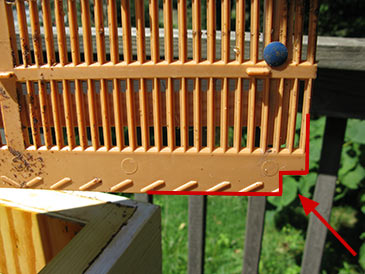 Second option: for best support, you can attach the propolis collector to a Layens frame using thumb tacks, the deep groves facing out. If your frame has tapered end bars (the top wider than bottom), you can cut back the taper on one side of the frame with a utility knife.