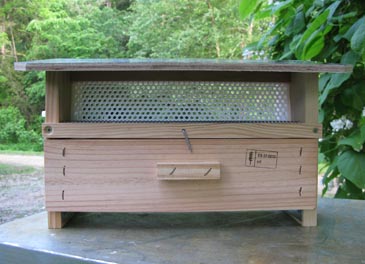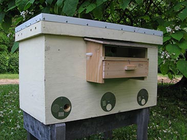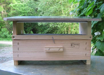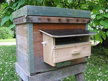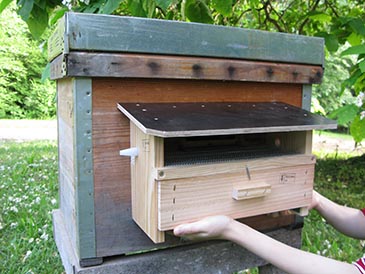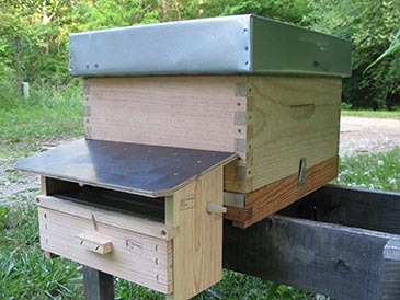 A pollen collector (also called pollen trap) is a covered porch over the hive entrance. It has a door with many holes for the bees to pass through, metal mesh floor, and a drawer to catch the pollen dropped by the bees.