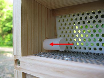 Pollen is bees’ only source of protein. They only have limited supply inside the hive and need to be able to replenish their reserves before they run out. With this pollen trap model, you don’t have to take it off when not in use – just raise the perforated door and the pollen starts flowing into the hive instead of dropping into the drawer. To open the door, put any kind of hook into a bottom-row hole – a hex key, a bent nail, a screw – and pull.