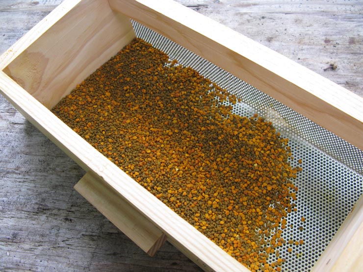Bees bring balls of pollen in special baskets on their hind legs. As the bee squeezes through a small hole to enter the hive, the pollen pellet is knocked off and falls through the mesh floor into the drawer. When done carefully, harvesting pollen in this way will not hurt the colony.