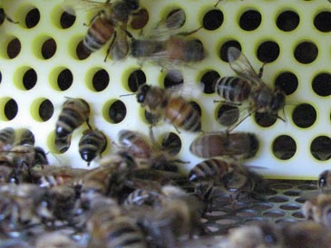 When you first close the door, bees become seriously disoriented. (Imagine your front door blocked so you get in and out through the crawl space!) It only takes them minutes to figure out they can leave the hive through the little holes, but learning to re-enter through the same holes takes longer – three days of good flying weather. Some bees may camp outside the hive the first night, bearding down from the pollen collector in protest. The second day you will see some bees confidently diving through the holes. By the end of the third day all bees readily get in/out through the holes and traffic gets back to normal.