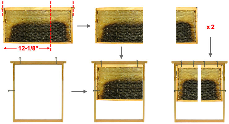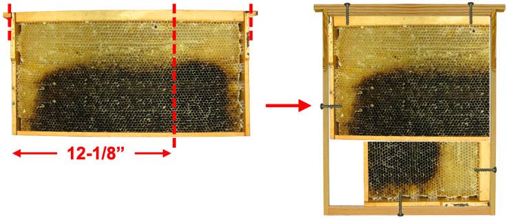 Repeat with all other frames, starting with brood. If you transfer medium Langstroth frames (6-1/4” deep), you can attach them in two tiers; the lower tier can be composed of two cutoffs if needed.
