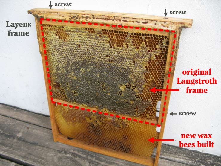 The basic idea is to cut the Langstroth frame, fit it inside an empty Layens frame, and attach with screws. The bees will fill out the remaining space with comb, making a neat Layens frame.