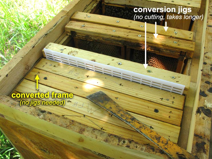 This method is very reliable and works really well. But if you find the prospect of cutting comb of an active colony too intense to your liking, consider a different approach that involves no cutting but calls for conversion jigs. After completing numerous transfers using different methods, the one described on this page is our favorite: very quick, the most reliable, and offering best results.
