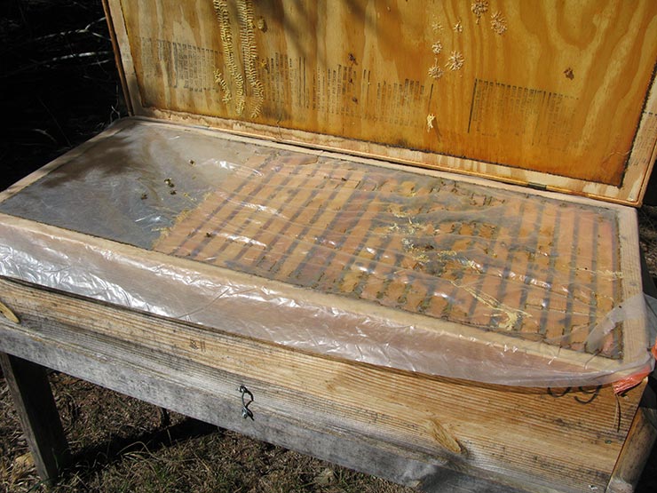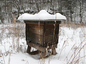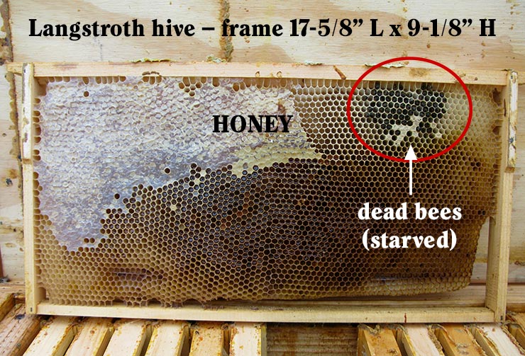 We use the wintering setup shown in Layens’s book, Chapter 24. For example, for a strong colony (bees cover 7 frames) at harvest time leave up to 7 frames at least 1/2 full of honey (about 30 lb), plus (in cold climates with springs that can be cool or rainy) two extra frames more or less full of honey, one on each end of the nest (9 frames total, about 45 lb). Fewer frames are required for smaller colonies or in southern climates with short winters.
