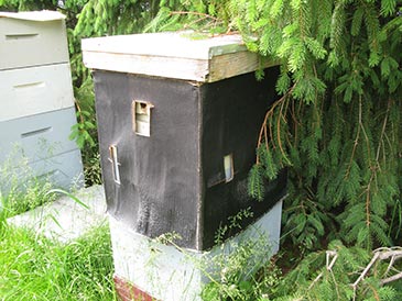 The 20-frame Layens hive insulated with natural wool offers the best protection from the cold of the winter and the heat of the summer. The walls and the bottom are permanently insulated with 1-1/2” of fleece; frames’ top bars are covered with a pillow stuffed with wool. A pillowcase filled with natural wool is best and has far better insulation value than other materials such as wood shavings. Leave at least 1/2” air space around and above the pillow to aid ventilation. This is our favorite wintering setup.