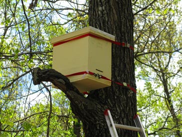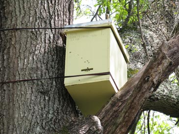 The bees proved totally indifferent towards the swarm trap attached right to their bee tree. A swarm preferred to move into a similar box hung some 50 ft away on an oak tree, property raised 15 ft off the ground.