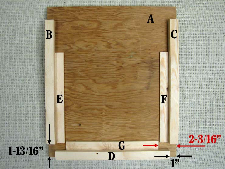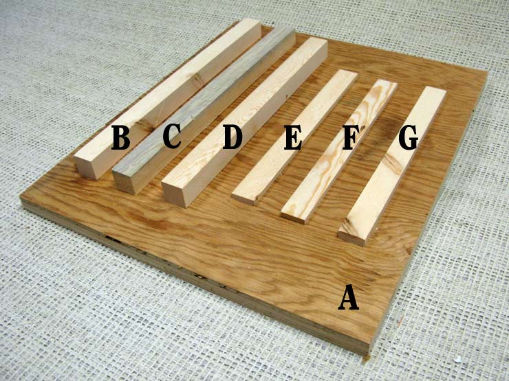 Step 3. Attach all the parts to the plywood using wood glue, screws (for Parts B, C, D — 3 per bar; predrill to avoid splitting wood), and nails (for parts E, F, and G — 4 per bar). Wipe off excess glue. You are done! Let it dry for 24 hrs and the jig is ready for use.