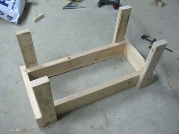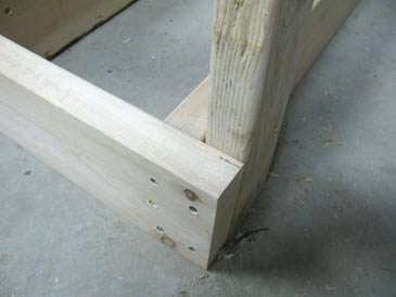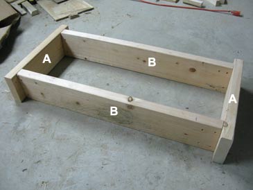 Step 4. Put a leg in the outside corner formed by A and B. Check to make sure the leg is square relative to both A and B. Attach with two screws through the leg into B, and two screws through A into the leg. Repeat with the other legs and you are done.