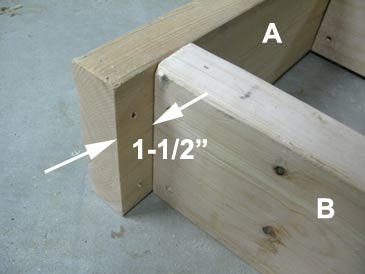 Step 2. Put B between A on a flat surface, B recessed 1-1/2” from the end of A as shown. Check for square corners and drive two deck screws per corner through A into B.