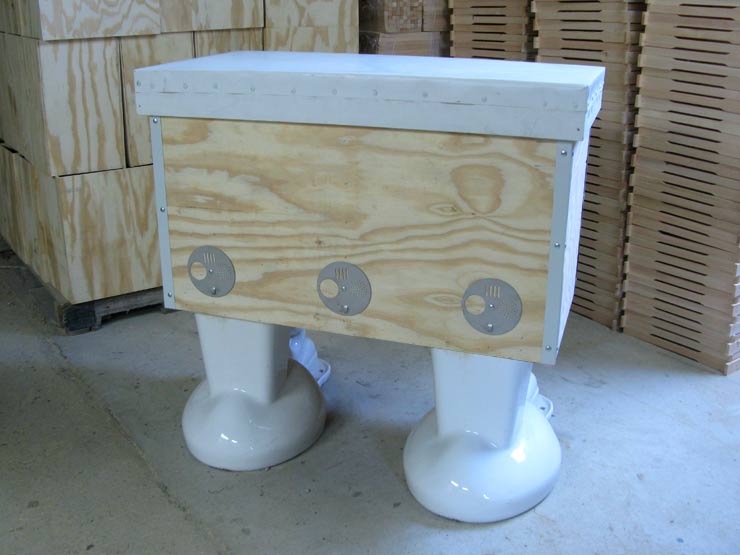 If, unlike me, you are not socially inhibited from using toilet bowls for hive stands, send me some pictures to warm my heart! Handle toilet bowls carefully as they easily crack if dropped. Drill 1/8” weep holes in the bottom of each inner cavity, including the bowl rim. Otherwise freezing water will crack the bowl, ruining your thousand-year hive support. If using a masonry drill bit, continuously pour water on it, but it will still burn out after a few holes. Diamond-tipped porcelain-cutting drill bits and hole saws work better.