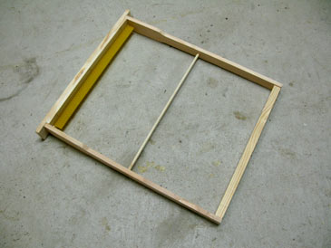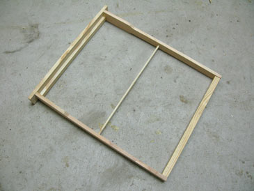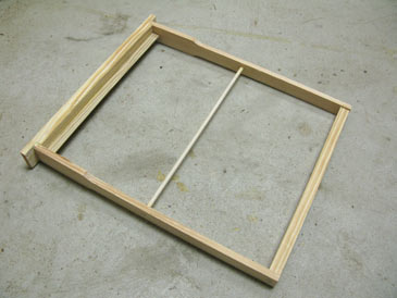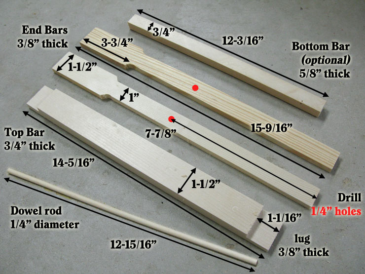 Start with the Layens frame parts described in the regular Layens frame plans: top bar, 2 end bars, bottom bar, plus a 1/4” dowel rod. Don’t drill any holes for steel wires.