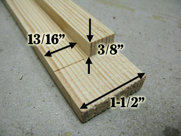 Step 1. With two passes of the table saw, cut a rabbet in the top bar, 3/8” deep by 13/16” wide. Save the wedge (if you use a 3/32”-kerf blade, the wedge will be 12-3/16” x 23/32” x 9/32”).