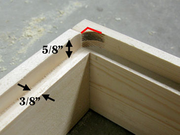Step 2. Flip the frame over; rout a 3/8” x 5/8” rabbet along the inner perimeter of the rim assembly. Square out the corners (red line) with chisel & hammer or a smaller-diameter straight router bit.