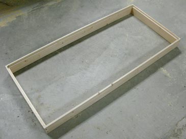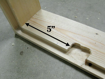 Step 3. Measure 5” from the inner corner of the rim assembly (on the long side) and rout out a slot the shape of your hinge, the same depth as the rest of the rabbet (3/8”). Repeat on the other end of the board.