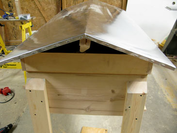 Step 14. Finishing touches. Attach hinges to the hive body with 1-1/8” screws. Cover the gable ends with screen (cut to size and staple into place) so insects and birds can’t nest in the roof. Drive eye screws into the top’s rim and the hive wall and connect them with rope to serve as stopper when you open the hive. Done!