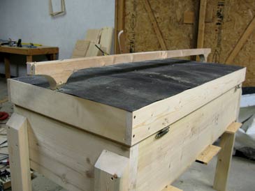 Step 7. Put the top on the hive body, the hinges facing the front of the hive. Fill with insulation (I use natural wool or the excellent cotton material R-13 Ultratouch, nominal 3-1/2” thickness, obtainable from large home improvement stores, especially the Menard’s.) Cover with roofing paper and staple it into place.