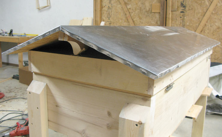 Gable roofs are great for stationary horizontal hives! They look pretty, don’t collect water and debris, and offer superior insulation against heat and cold. Roof overhangs shade the hive box and protect it from rain. Hinges make opening the top luxuriously easy.
