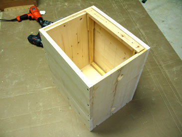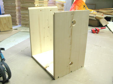 Step 6. Position part BOT between parts F and B (both rabbets face inside), check for the right angle and assemble on glue and 1-5/8” deck screws. Predrill with a countersink bit to prevent splitting.