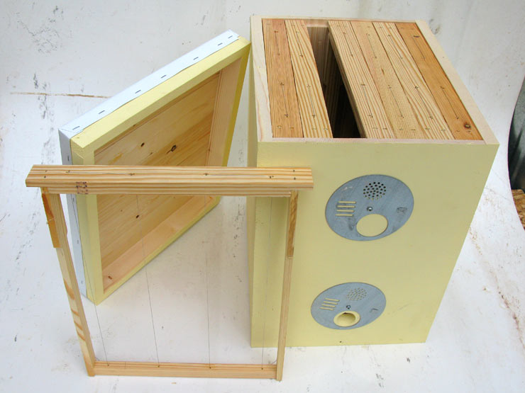 This seven-frame Layens hive weights 20 lb with frames. If you plan to use is as a swarm trap and weight is an issue, consider building the 6-frame plywood version which is 5 lb lighter.